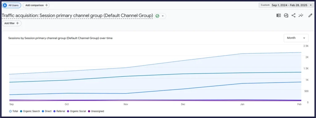 - Monthly organic sessions more than doubled, peaking at 2,000+ visits in the last six months.